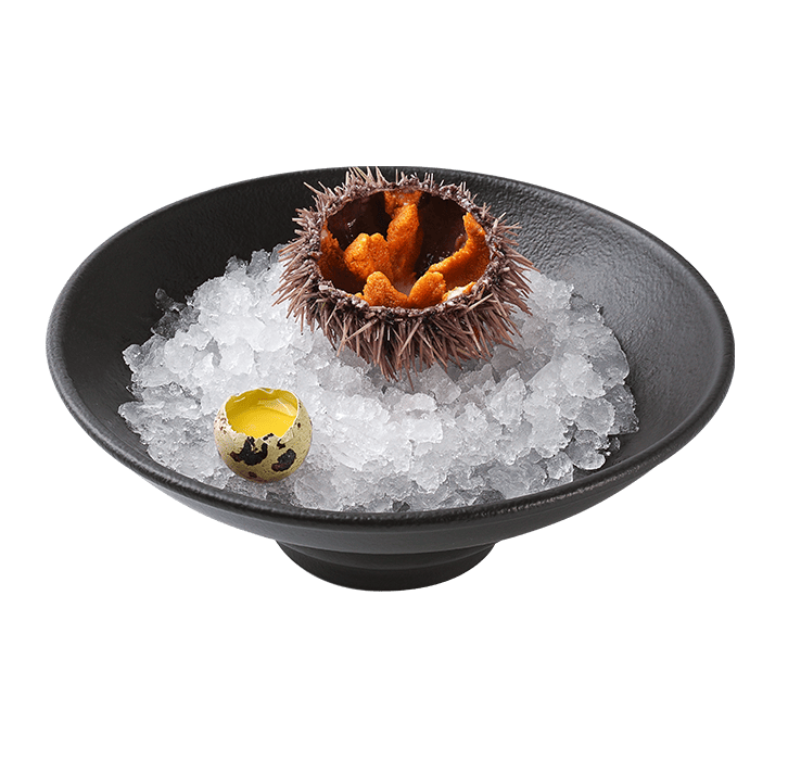 Икра морского ежа. Подаётся с желтком перепелиного яйца. Источник важных аминокислот, жиров омега-3, витаминов А, Е, D.