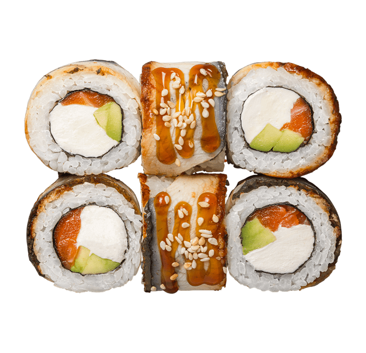 Угорь, лосось, авокадо, сливочный сыр, соус терияки, кунжут