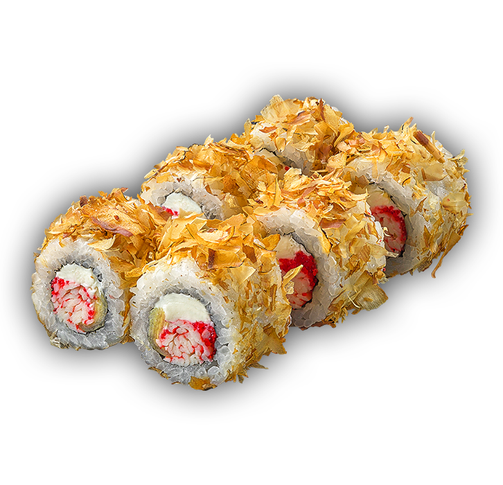 Краб, сливочный сыр, лук сибулет, икра масаго, стружка тунца