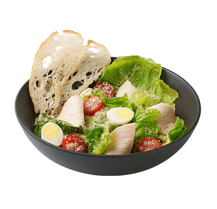 Салат романо с карпаччо из куриной грудки, томатами черри, перепелиным яйцом, пармезаном, гренками и фирменным соусом