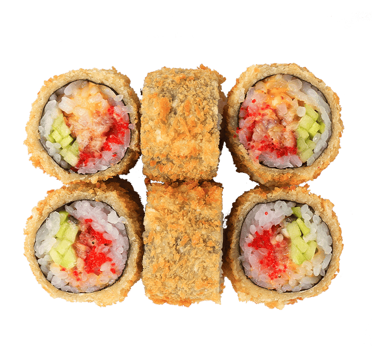 Угорь, огурец, соус спайси, икра масаго, хрустящая панировка